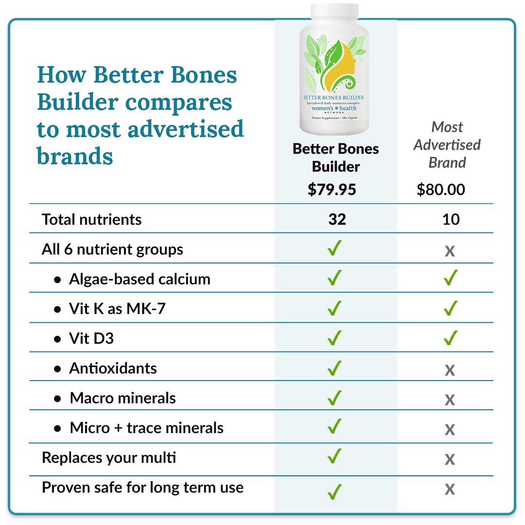Better Bones Builder is much more robust, formulated for women who already have a diagnosis of osteopenia or osteoporosis—or who are considered at higher risk due to multiple factors. Builder provides the full spectrum of 32 nutrients Dr. Susan Brown has identified as essential for comprehensive bone renewal.
