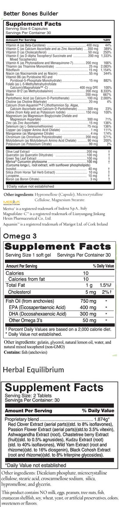 - Automatic resupply — maintain your momentum and continue to build better bones with a convenient monthly shipment of Better Bones Builder, Omega-3s and Herbal Equilibrium. There’s never any purchase commitment and you may cancel at any time.