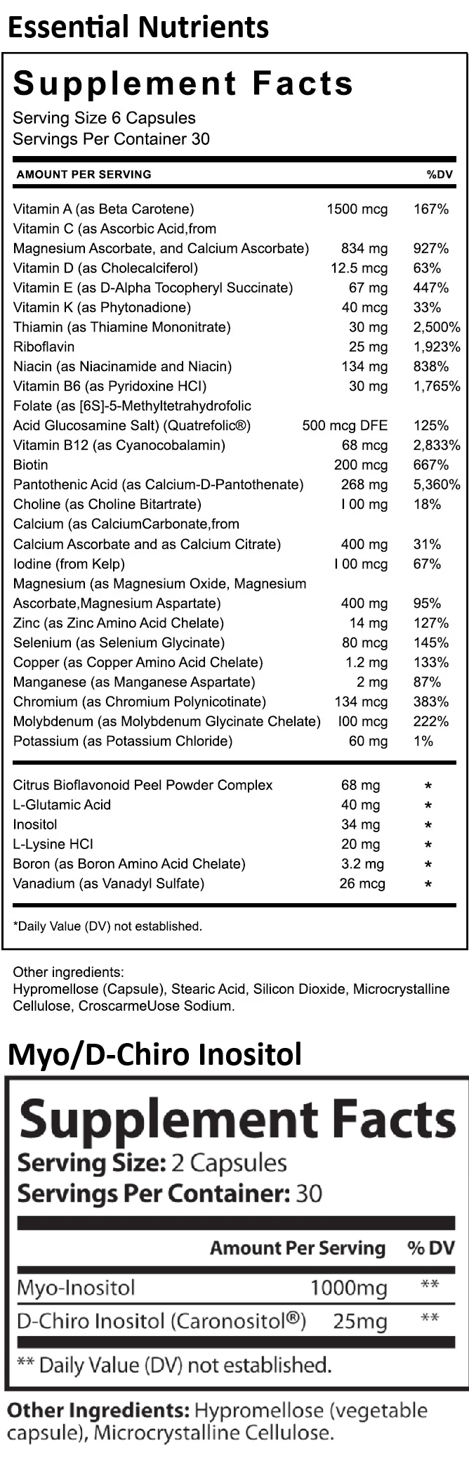 Our Fertility Support Combo combines Essential Nutrients, our flagship multi-vitamin formulated with precursor nutrients for hormonal balance and reproductive health, and Myo/D-Chiro Inositol. Inositol is scientifically proven to enhance fertility, especially ovulation. Some studies show dramatic improvement.
