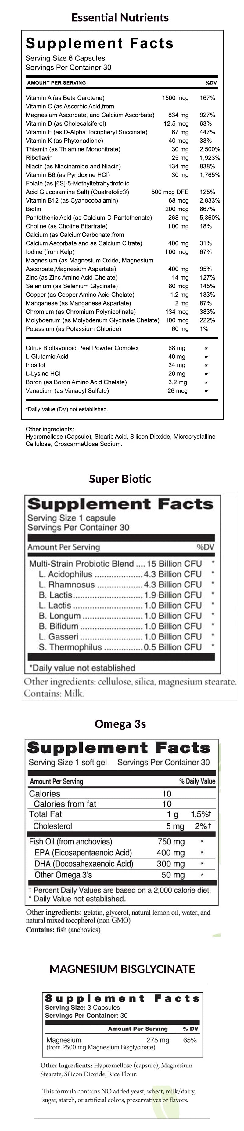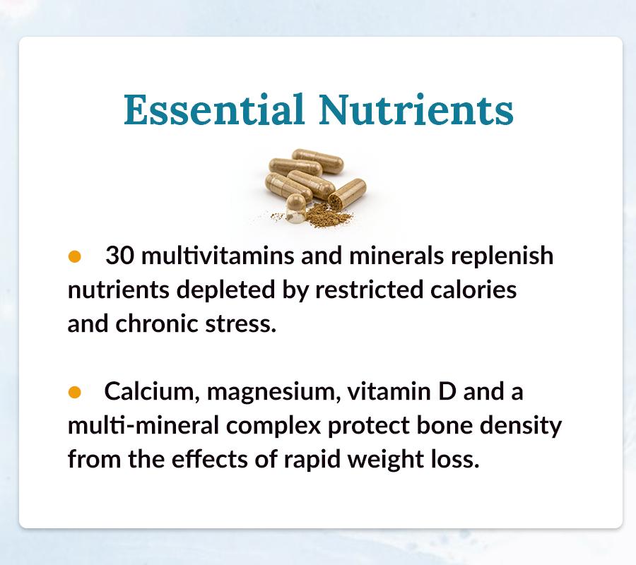 Essential Nutrients provides 30 key nutrients in their most bioavailable forms to optimize metabolism, improve mental clarity, and keep you feeling strong and steady throughout your day. Restores the vitamins and minerals that your body is missing as your meals, appetite and waistline shrink.