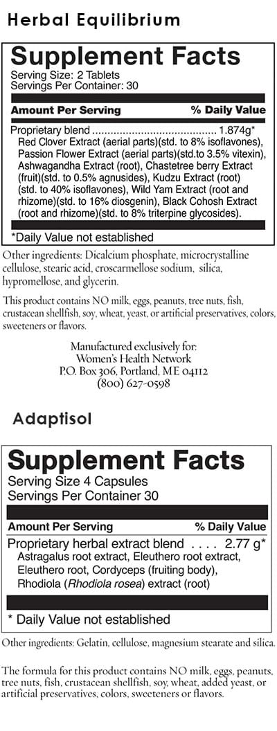 Menopause is challenging by itself but when you’re also dealing with stress symptoms and adrenal imbalance, your symptoms can increase exponentially and their severity and frequency can be magnified. Fluctuating hormones in menopause and their aftereffects can cause severe symptoms like hot flashes, fatigue, irritability and insomnia. Adrenal hormonal balance can also become impaired due to stress, leading to anxiety, fuzzy thinking, weight gain and moodiness. All this on top of your menopause symptoms! Our Hormonal Stress Combo includes both Herbal Equilibrium (menopause symptoms) and Adaptisol (adrenal stress issues) to help resolve both imbalances simultaneously for better, longer-lasting relief.