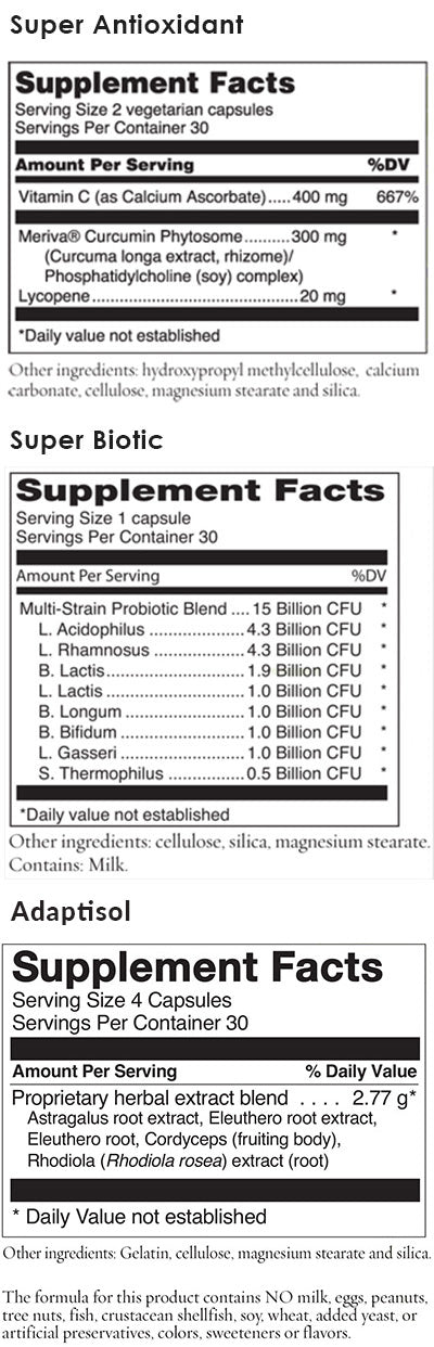 For Super Antioxidant — take one vegetarian capsule twice a day, once with breakfast and another with lunch or dinner.
