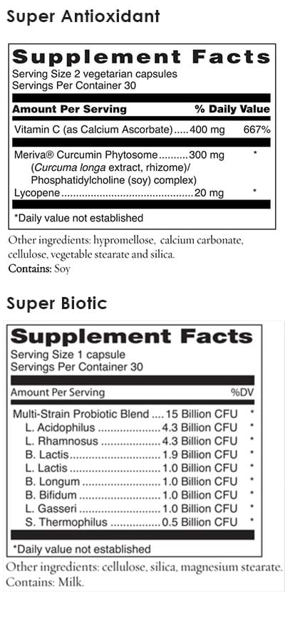 For Super Antioxidant — take one vegetarian capsule twice a day, once with breakfast and another with lunch or dinner.