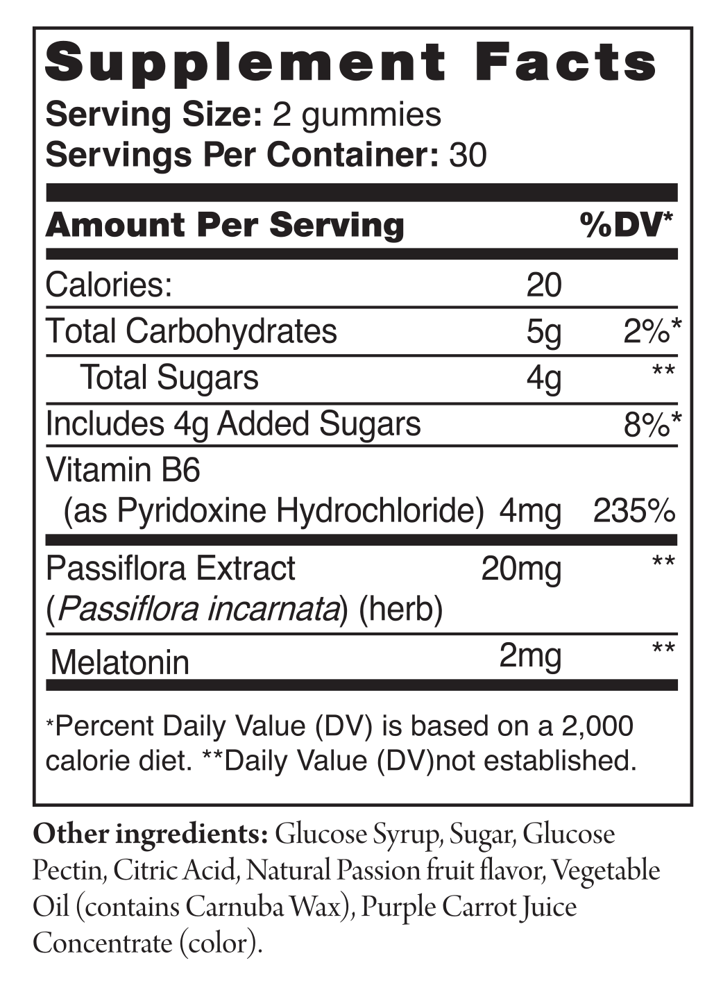 - Passiflora Extract: (passion flower) Provides calming effects, enhances GABA activity and regulates the circadian rhythm.