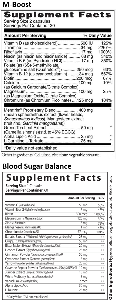 Metabolic Syndrome affects more than 35% of women and blocks their efforts to lose weight. This is a “doom loop” because Metabolic Syndrome also contributes to chronic weight gain. But science has shown that Metabolic Syndrome can be reversed through dietary and lifestyle changes plus targeted supplements. Our Combo helps you achieve this turnaround with a dual approach to normalizing insulin metabolism. Our Blood Sugar Support and M-Boost are each scientifically shown to promote healthy weight management and metabolic health, but together pack a one-two punch for you to achieve your weight loss goals.